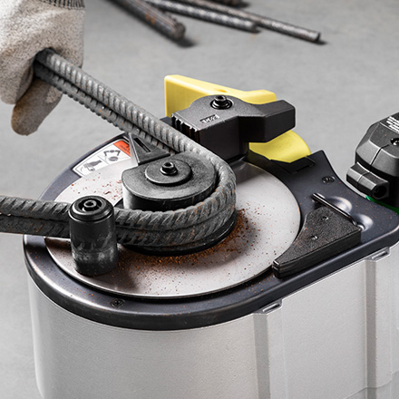– 역회전 모드, 트리거를 당기면 밴딩 롤러가 역회전하여 휘어진 철근을 쉽게 제거 가능, 밴딩 각도 확인 용이